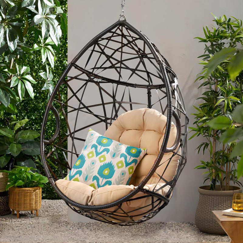 Our custom fitted Beige polyester seat cushions are made of a tough, yet soft, weatherproof fabric. The cushions are removable and washable. We created our comfortable tear-drop hanging chair with wicker and iron for a sleek modern look. This unique swinging chair is the perfect addition to any space outside, like a backyard patio, deck, in a sunroom or garden, or near a pool, or outdoor Bar.